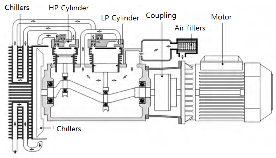 왕복 운동을 통해 압축된 공기는 1단 냉각기로 이송된다. 반면 HP 실린더는 1단 냉각기에서 냉각된 공기를 받아 2차 압축을 수행하고, 이 압축된