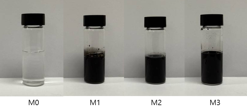 Fig. 2은 MWCNT와 용액의 혼합 비율을 달리하여 제조한 코팅 용액이다. Fig. 2는 MWCNT를 포함한 코팅 용액의 외관을 보여주며, 용액의 분산 정도와 농도 특성을 시각적으로 확인할 수 있다. MWCNT 함량 증가에 따라 용액의