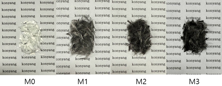 Fig. 3은 MWCNT 코팅 농도에 따른 PET 섬유의 외관 변화를 나타낸다. 가장 왼쪽의 무코팅 섬유는 PET 고유의 투명한 백색을 유지하고 있으나, MWCNT