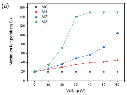 간격(40 mm, 120 mm)별로 측정한 결과를 나타낸 것이다. Fig. 6(a)에서 나타난 바와 같이 전극 간격 40 mm의 조건에서 M3 시료에서 30 V의 낮은 전압에서 150℃의 온도에 도달하는 것을 확인하였다. 그러나