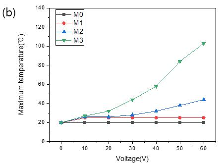 동일한 농도에서도 40 mm 조건 대비 더 낮은 발열 온도가 관찰되었다. 동일한 조건에서 전극의 간격을 120 mm로 증가한경우 Fig. 6(b)에서와 같이 M3 시료에서 인가 전압이 60 V일 때 최대 온도가 약 100°C로 감소하였으나, 이는 전극 간 거리 증가에 따른 저항 상승 및 열