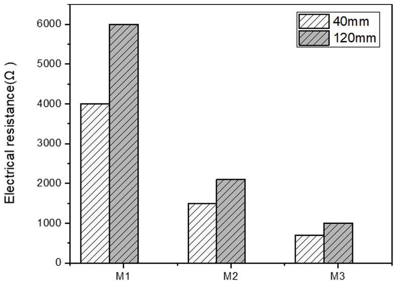 따라 전자 이동이 용이해지는 구조적 특성이 반영된 결과이다(Jee et al., 2013). 전극 간격을 40 mm로 설정한 경우, M3 시료가 약 700 Ω으로 가장 낮은 전기저항을 나타냈다. 반면, 동일한 측정 조건에서 전극 간격을