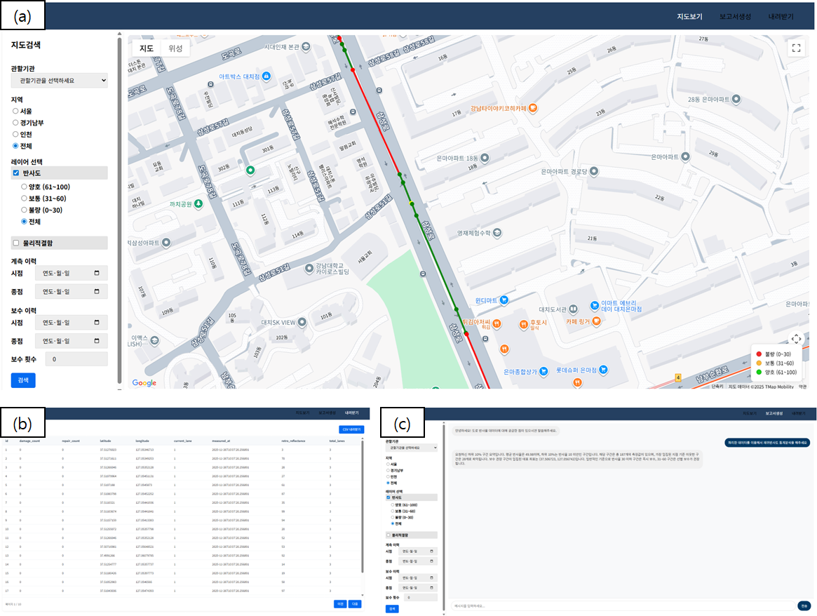 설계되었으며, 사용자가 특정 구간을 요청할 경우 해당 위치의 좌표, 주행차량 기반의 재귀반사도 값, 물리적 손상 정보를 일관된 형식으로 제공한다.