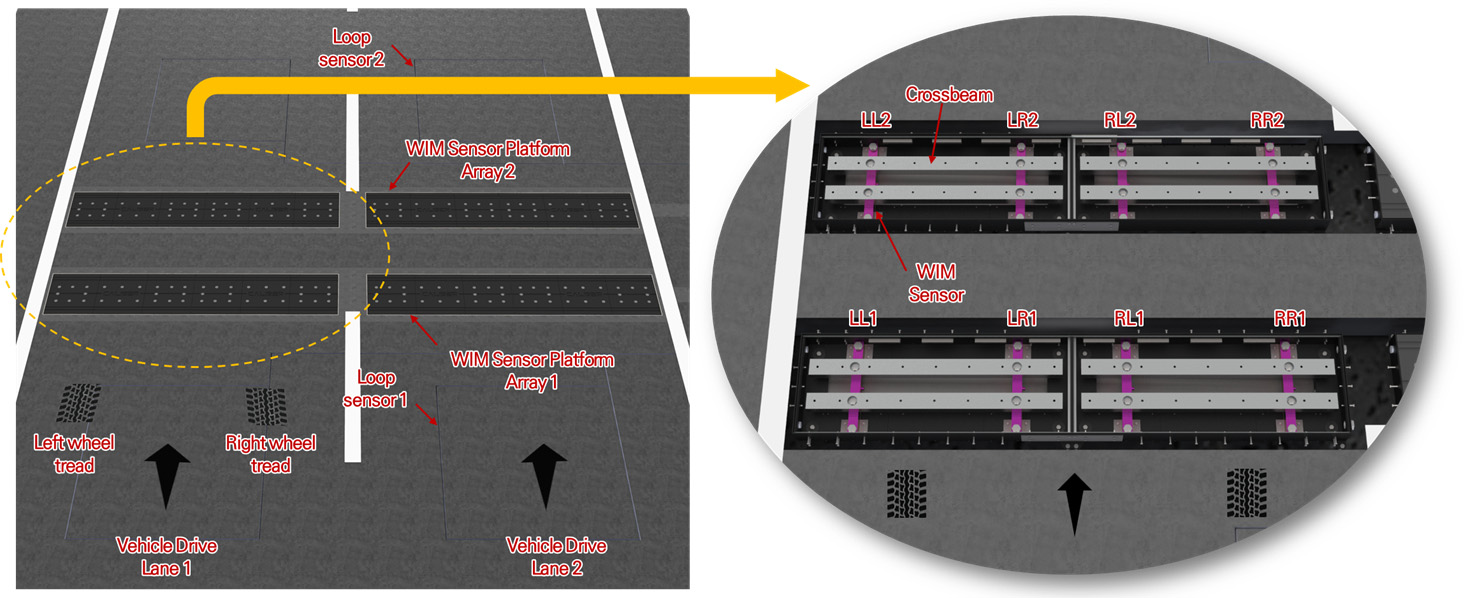 각 플랫폼은 하단에는 로드셀(LL, LR, RL, RR)이, 상단에는 하중을 전달하는 크로스빔이 배치된 형태로 설계되어 있다. 차량 바퀴가 플랫폼을