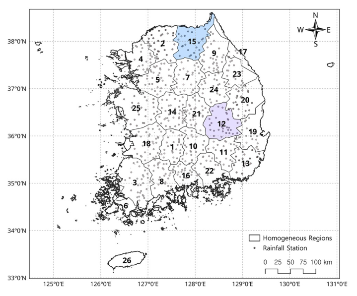 ๋ณธ ์ฐ๊ตฌ์์๋ Hosking and Wallis(2005)๊ฐ ์ ์ํ L-moment ๊ธฐ๋ฐ ์ง์ญ๋น๋ํด์ ๋ฐฉ๋ฒ์ ์ ์ฉํ์๋ค. ๊ตฌ์ถ๋ ๋์ง์ง์ญ ๋ด ์ง์ ๋ค์ ๊ฐ์ฅ ์ ํฉํ ํ๋ฅ ๋ถํฌํ์ ์ ์ ํ๊ธฐ ์ํด, ์ ํฉ๋ ๊ฒ์