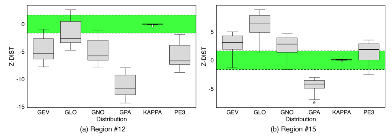 ์ถ์ ์ด ๋ถ๊ฐ๋ฅํ์ฌ ์ ์ฉ์ด ์ ํ์ ์ธ ๊ฒ์ผ๋ก ํ์ธ๋์๋ค. ๋ฐ๋ฉด, 15๋ฒ ์ง์ญ์ kappa ๋ถํฌ์ ์ ํฉ๋ ๊ธฐ์ค์ ์ถฉ์กฑํ์ฌ ๊ธฐ์กด 3๊ฐ ๋งค๊ฐ๋ณ์๋ฅผ ๊ฐ๋ ํ๋ฅ ๋ถํฌํ์