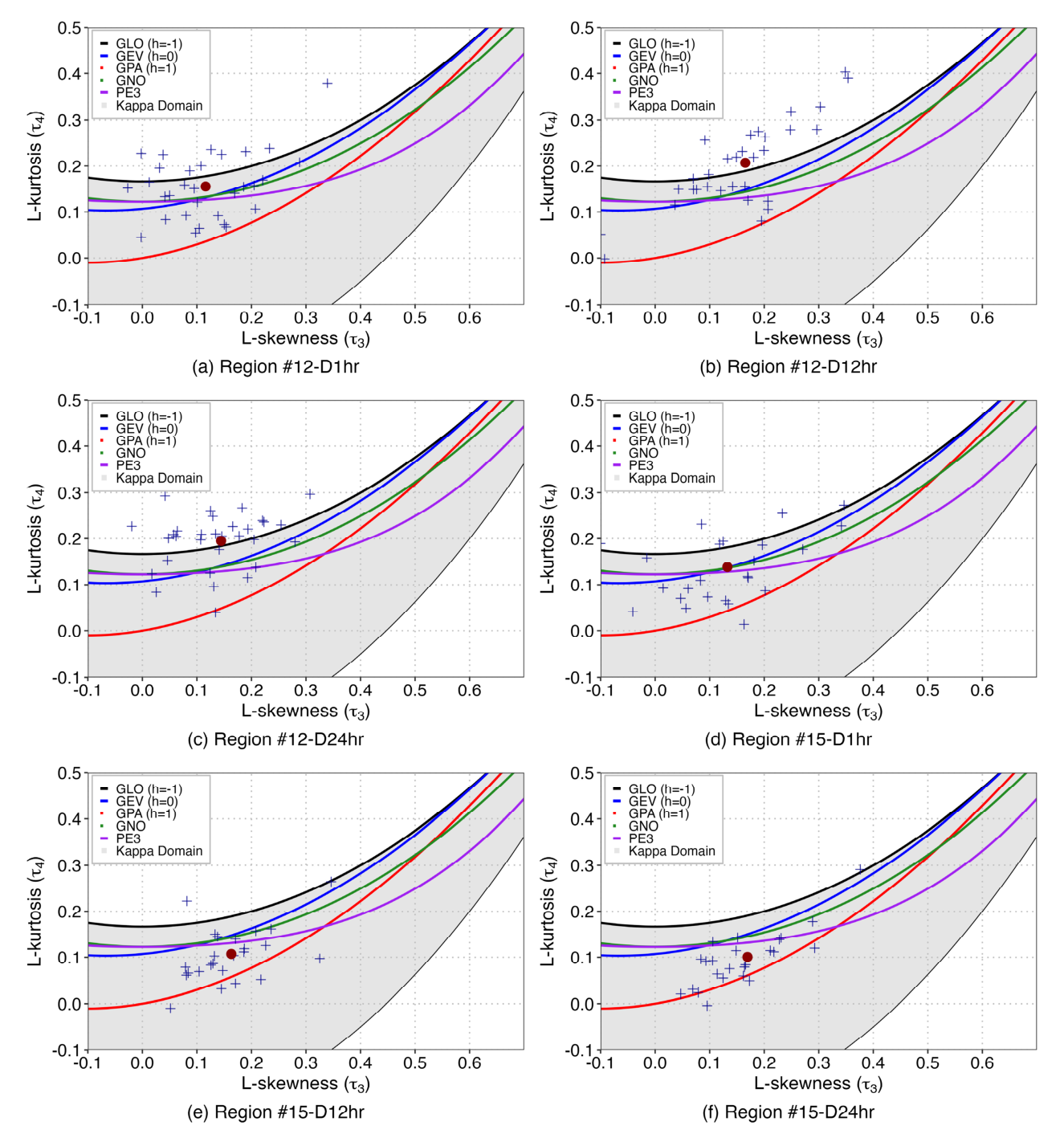์ฌ๊ธฐ์, kappa ๋ถํฌ๋ $h \ge -1$ ์กฐ๊ฑด ํ์ $\tau_3$๊ณผ $\tau_4$๋ก ์ด๋ฃจ์ด์ง L-moment ratio diagram ์์์
