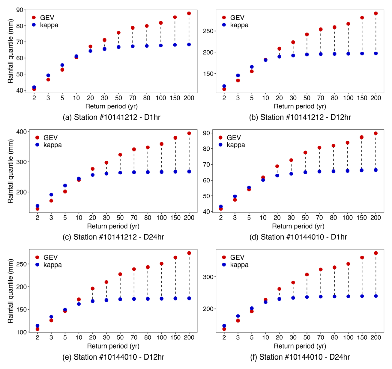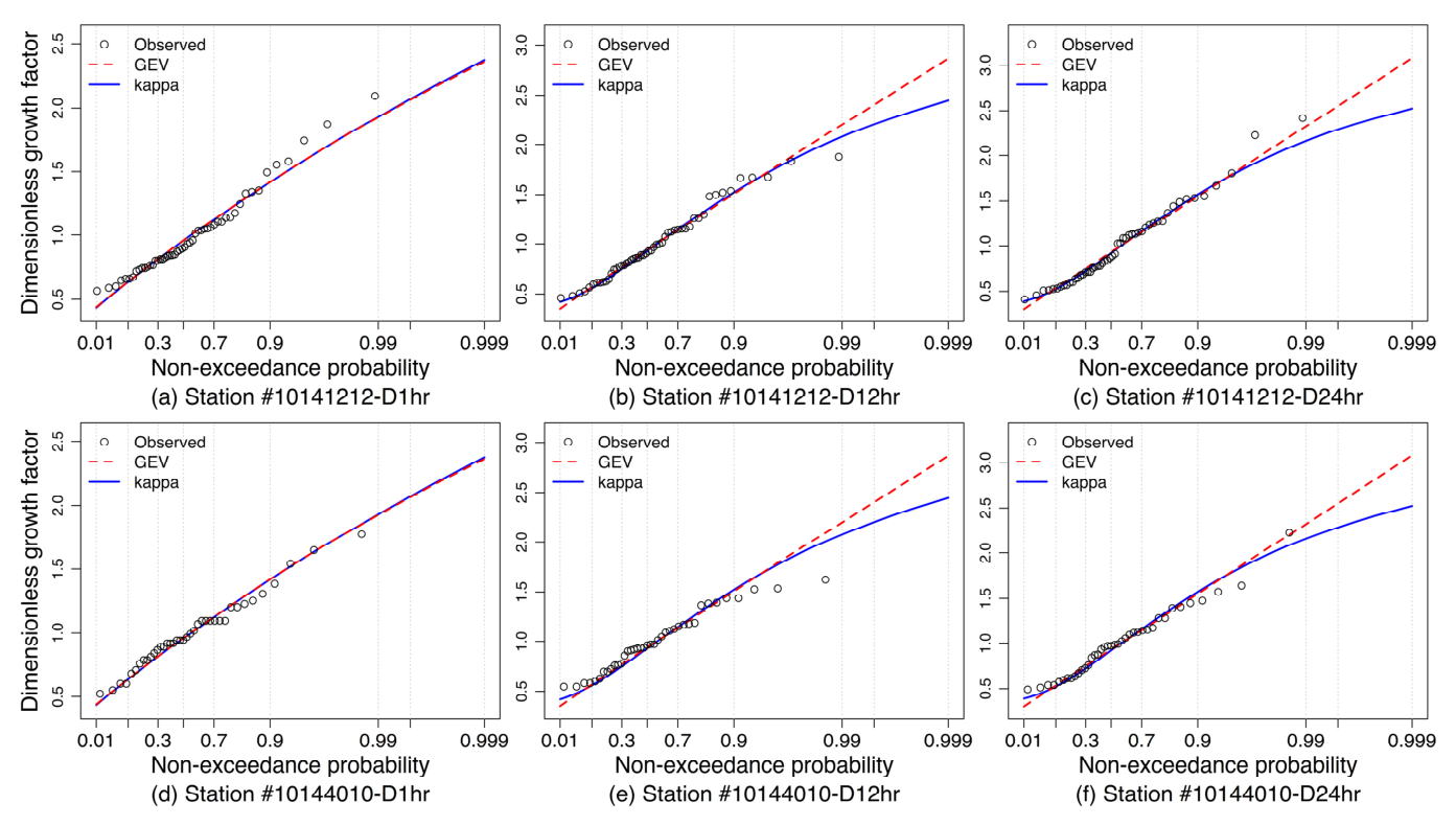 Fig. 4์์ ๋ํํ๋ ๊ด์ธก์(#10141212, #10144010)๋ฅผ ๋์์ผ๋ก, ์ง์๊ธฐ๊ฐ 1, 12, 24์๊ฐ์ ๋ํด kappa์ GEV ๋ถํฌ๋ก๋ถํฐ ์ฐ์ ๋