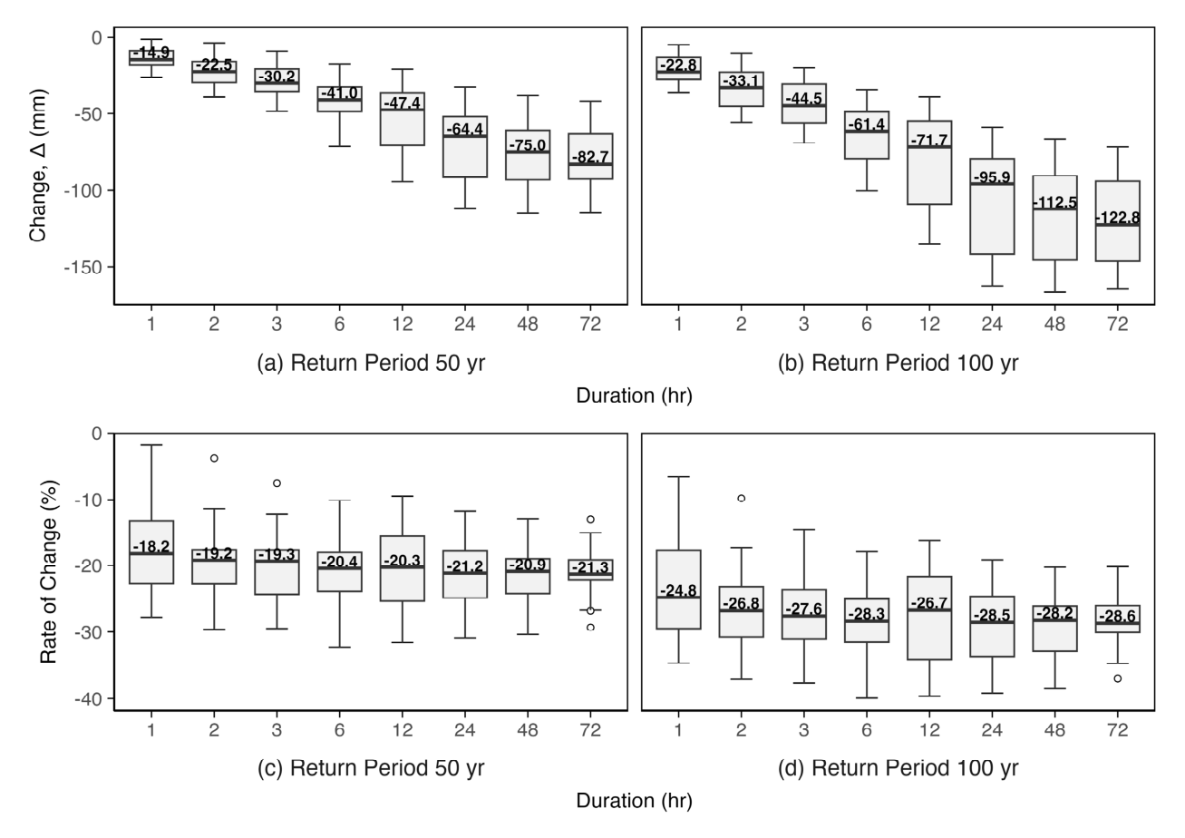 Fig. 5. Changes in Rainfall Depth (mm) and Percentage Change (%) of kappa Relative to GEV Distribution for Region #15. (a), (b) Change; (c), (d): Rate of Change