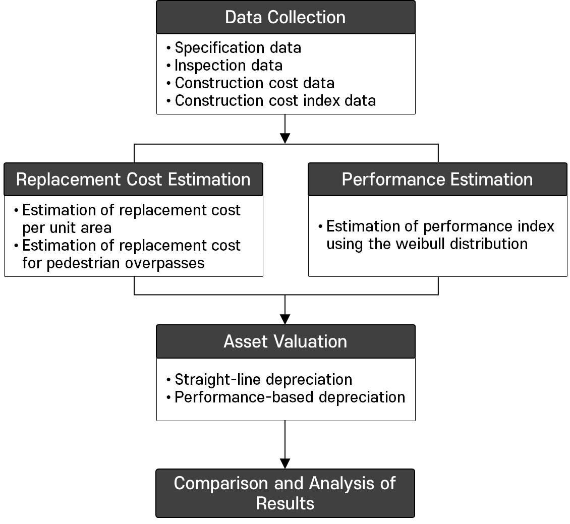 본 연구에서는 보도육교의 자산가치를 합리적으로 평가하기 위해 Fig. 7과 같이 앞서 추정한 보도육교의 재조달원가와 성능지표를 활용한 평가 방법을 제안하고 기존 방법과 비교하고자 한다.