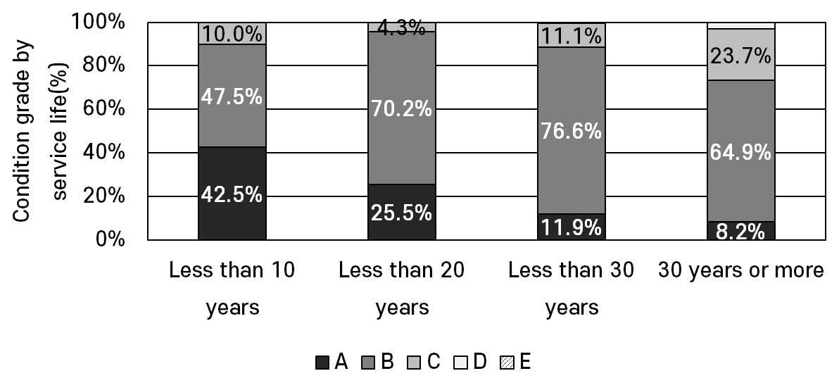 본 연구에서 제안하는 ESLD 방법과 PBD 방법을 통해 추정한 현재 자산은 초기 자산 대비 약 53.5%∼70.3% 수준으로 Fig. 10과 같이 양호한 상태로 유지되고 있는 보도육교의 현재 성능이 잘 반영된 점을 고려했을 때, 자산가치가 합리적으로 평가된 것으로 판단된다. 또한, Fig. 11과 같이 노후화된 보도육교 일수록 상태등급이 낮아지는 열화 특성이 보여 단순히 기준내용연수동안 일정한 금액을 감가하는 SLD 방법 및 ESLD 방법보다
