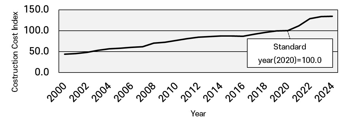 2024년 말 공표된 건설비공사지수에 따르면, 2022년 1월 지수는 120.99이고 2024년 말 지수는 134.43이다. 2022년 1월 기준으로
