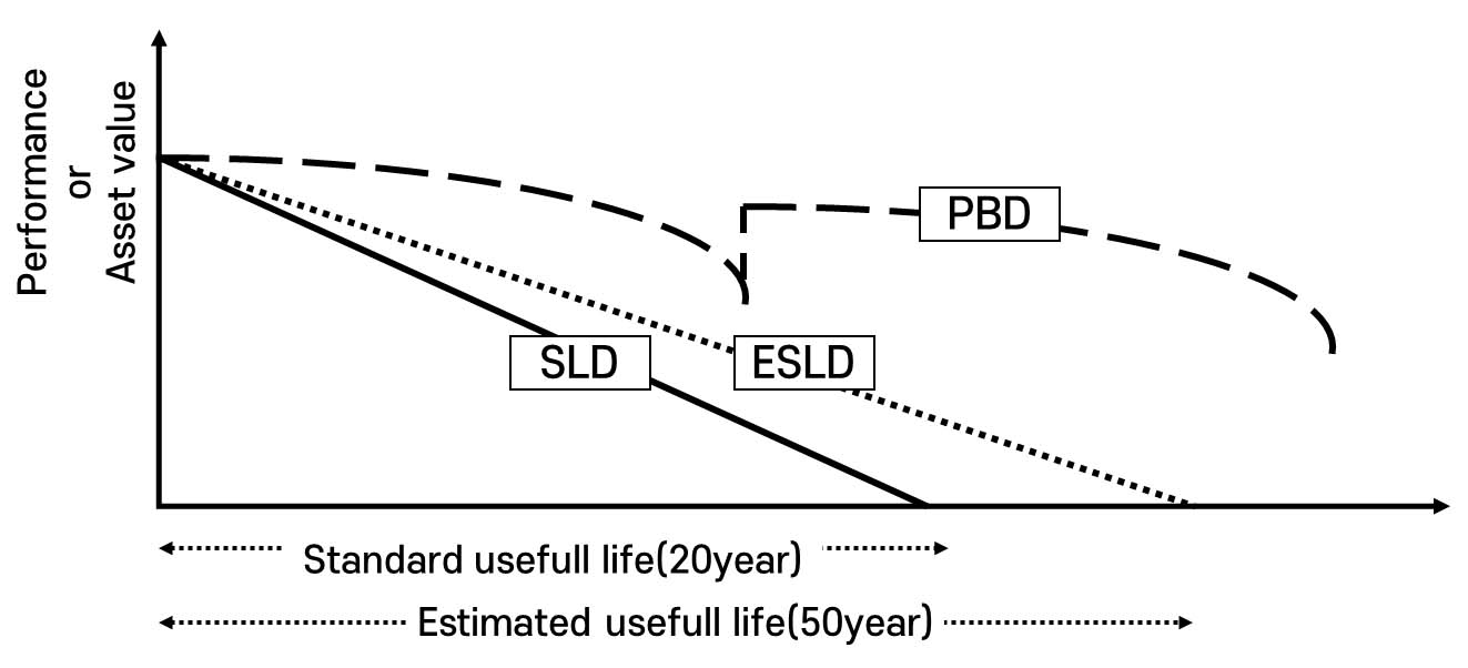 기준내용연수 20년 대신, 와이블 분포로 추정한 평균수명 50년을 적용한 추정 수명 기반 감가상각(Estimated Service Life-based