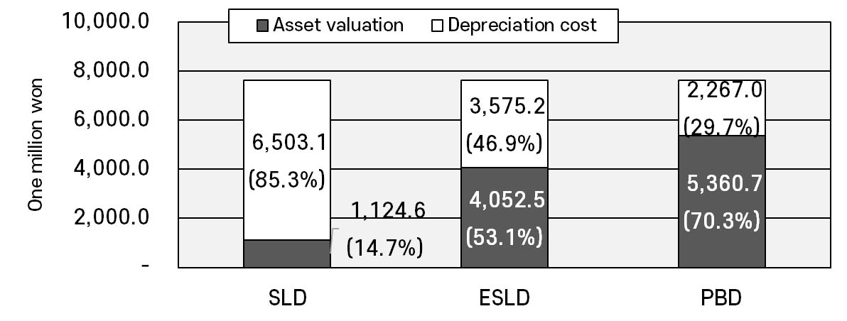 각각 약 4,052.5억 원, 약 5,360.7억 원으로 평가되었고 SLD 방법보다 약 3.6∼4.8배 높게 분석되었다. 방법별 연평균 감가상각액을