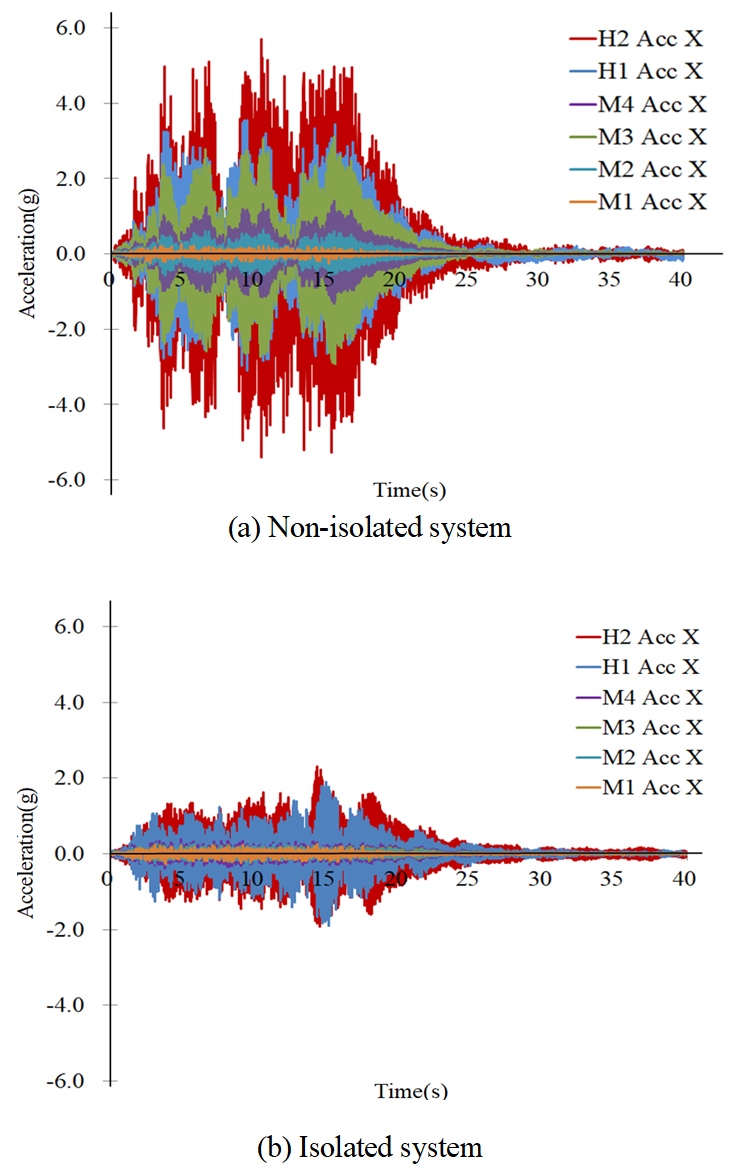 훨씬 크게 나타난 것은, 실제 장비 내부 부품이 구조물보다 먼저 기능 상실에 도달할 수 있음을 보여준다. 그러나 면진 테이블을 적용한 경우 응답의