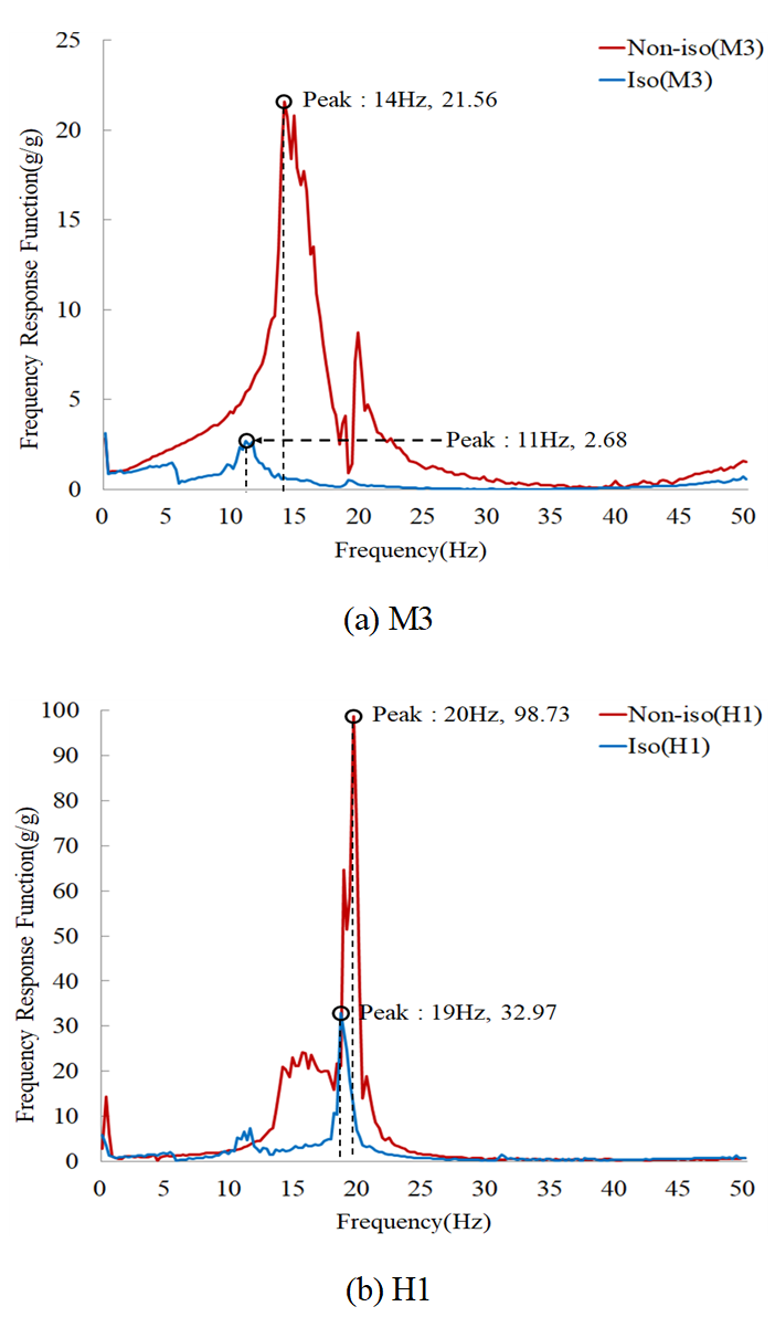 (2) 비면진 조건에서 캐비닛 상부(M3)는 약 14 Hz에서 최대 FRF 21.56 g/g가 관찰되었으나, 면진 적용 시 공진 주파수가 11 Hz로