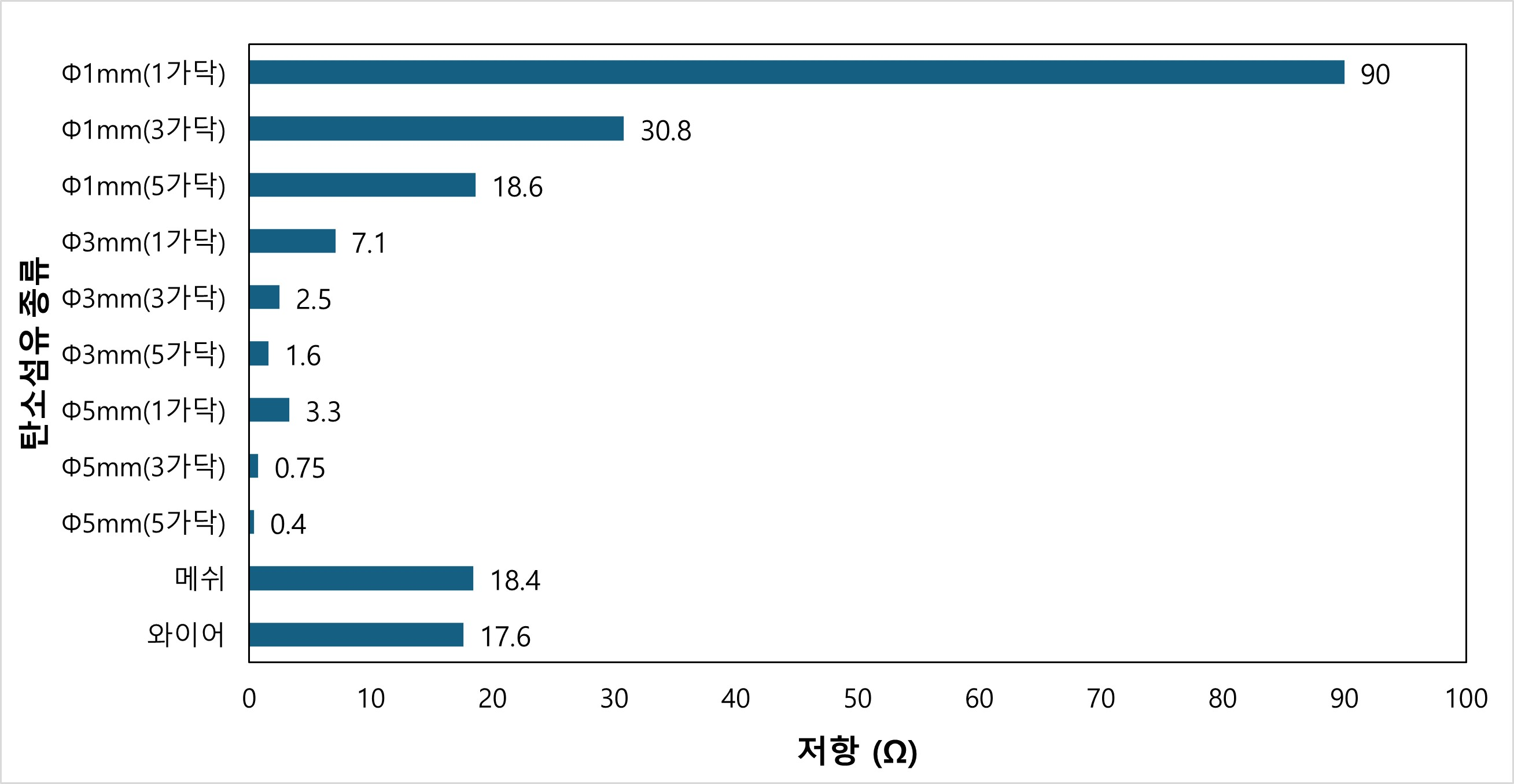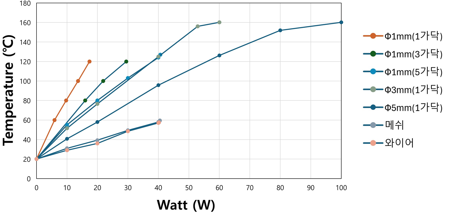 Φ1 mm(1가닥) 탄소섬유가 가장 큰 기울기를 보여 에너지 효율이 우수함을 확인하였다. 반면 메쉬⋅와이드 타입은 낮은 저항으로 전력 대비 발열 효율이