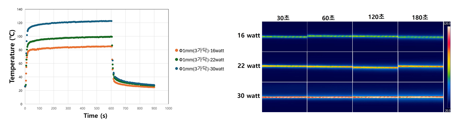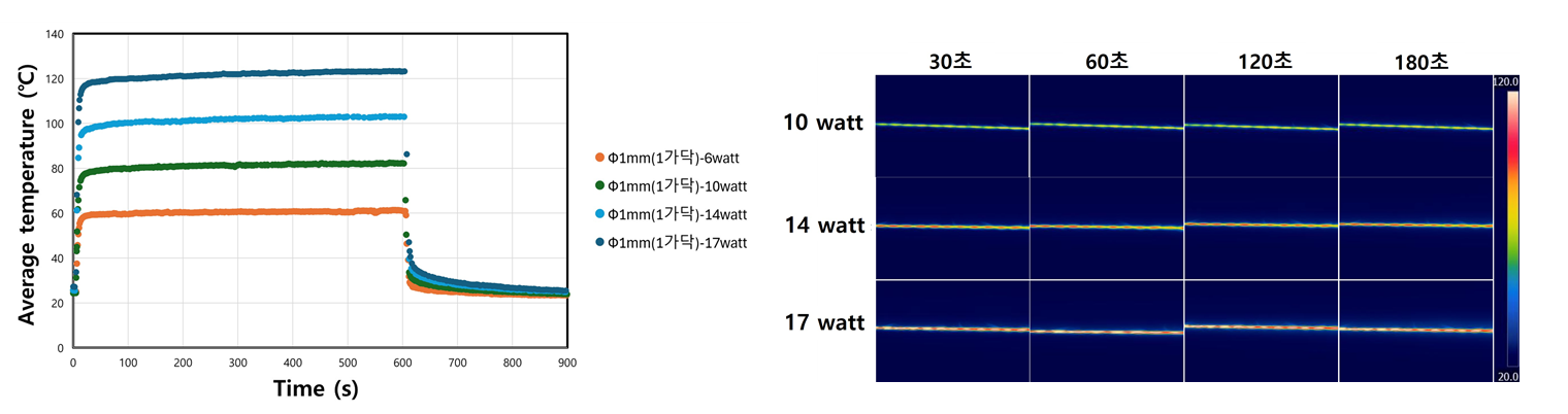 mm(1가닥) 탄소섬유는 30 W 전력에서 약 100초 이내에 120℃까지 온도가 급격히 상승한 후 안정화되었으며, Φ1 mm(3가닥) 섬유 역시