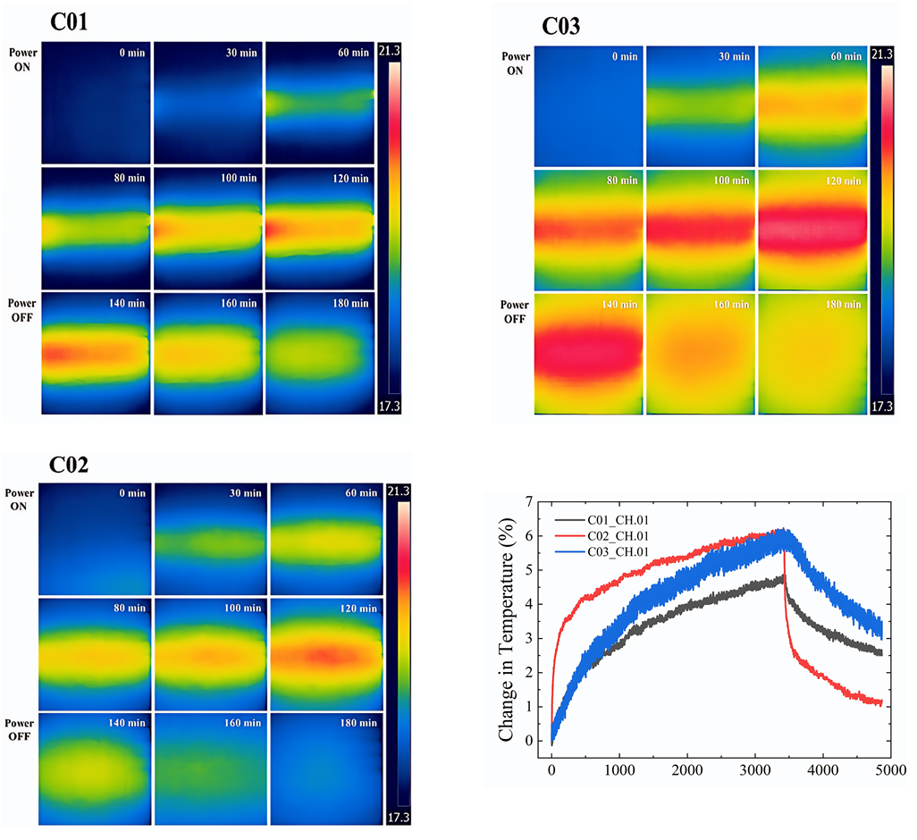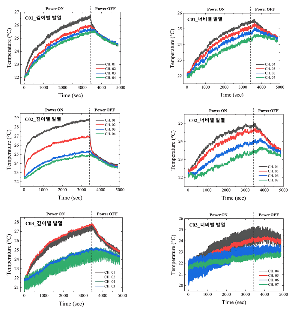 높은 열전도성에 기인하여 발열체의 열이 표면으로 신속하게 전달된 결과로 판단된다. 이와 대조적으로, 전원을 차단한 냉각 구간에서는 C03(PCM)이