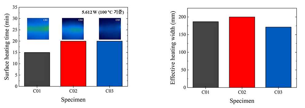 22 W에서 약 100℃까지 빠르게 도달하는 우수한 초기 발열 성능을 보였다. 두 샘플 모두 열화상 이미지에서 전극부 과열 없이 길이 방향 균일한
