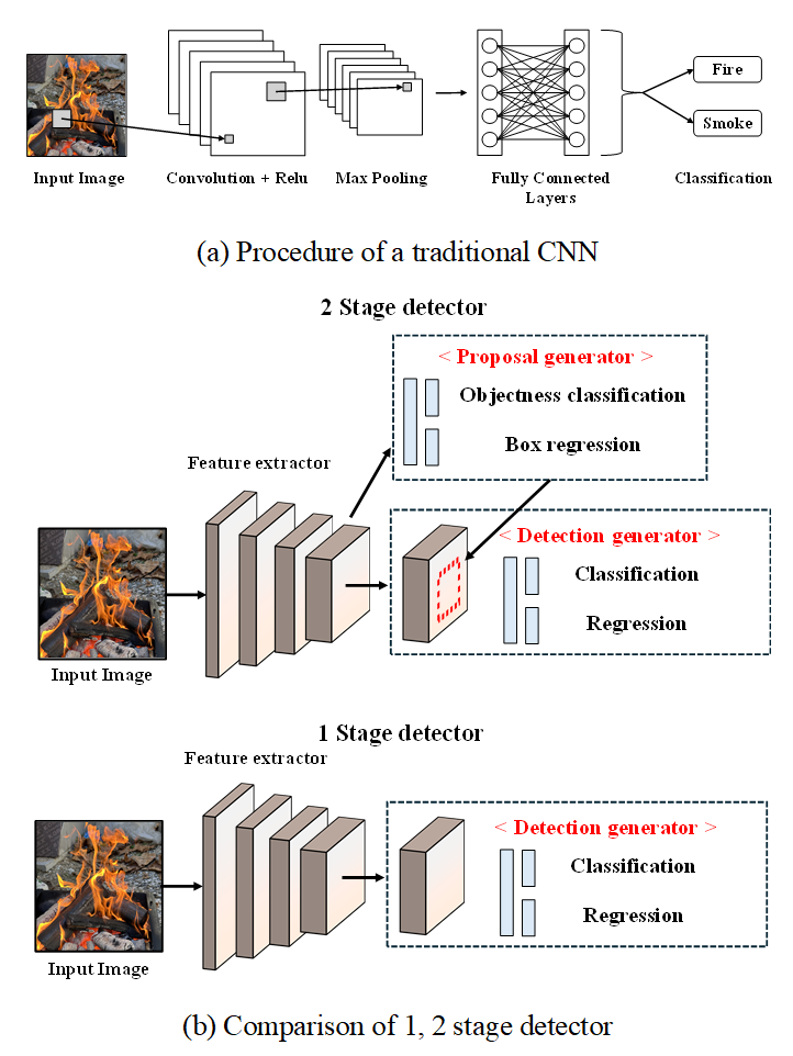 detector 및 2-stage detector가 주로 활용된다. Fig. 1(b)에 나타낸 바와 같이, 전자는 이미지 전체에 대한 특징들을 한 번에 추출하여 객체를 검출하는 반면, 후자의 경우엔 이미지 내에서 검출 대상이 있을