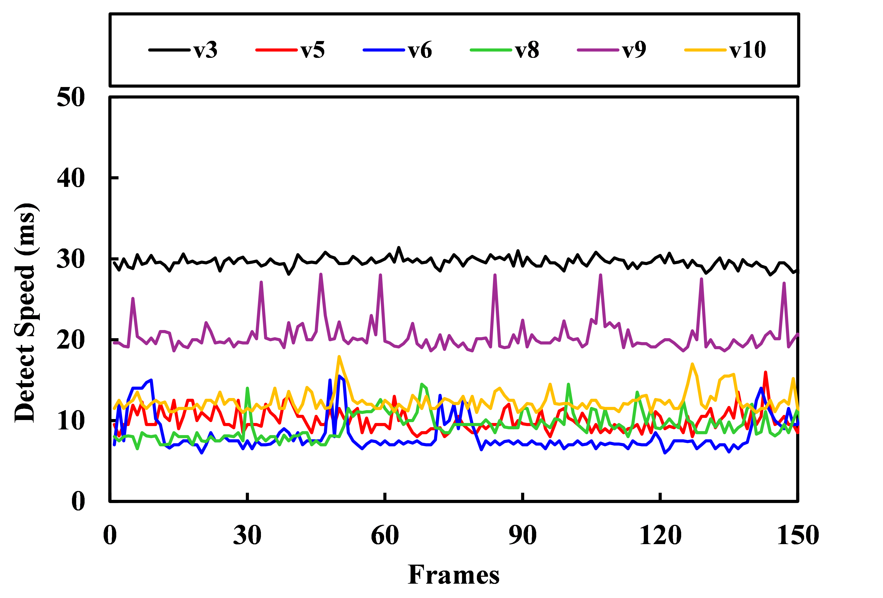 ms, 8.5 ms, 9.3 ms, 20.4 ms, 12.3 ms로 나타났다. GPU 환경에서 v9 및 v10의 검출 속도가 이전 버전들보다 느리게