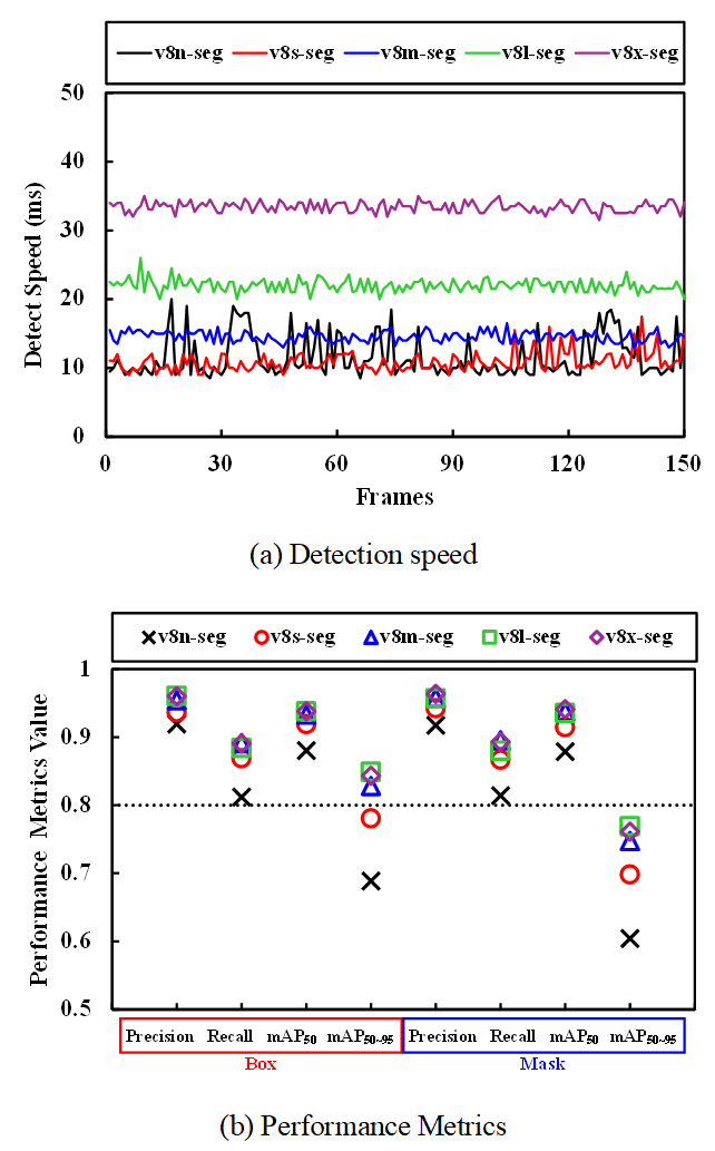 검출 속도를 보였다. 따라서, 예측 성능과 검출 속도를 모두 고려하여 YOLOv8m-seg 모델을 최종 모델로 선정하였으며, 이 모델을 활용하여 실시간