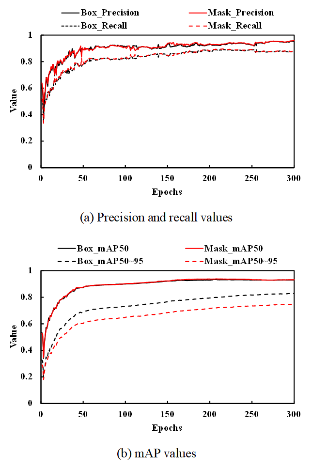 box, B) 및 분할(Mask, M)에 대한 개별 성능을 Table 3에 정리하여 나타내었으며, 마지막 학습 횟수의 모델로 테스트 세트에 대해 정밀도, 재현율, mAP50 및 mAP50∼95이 각각 0.96, 0.89,