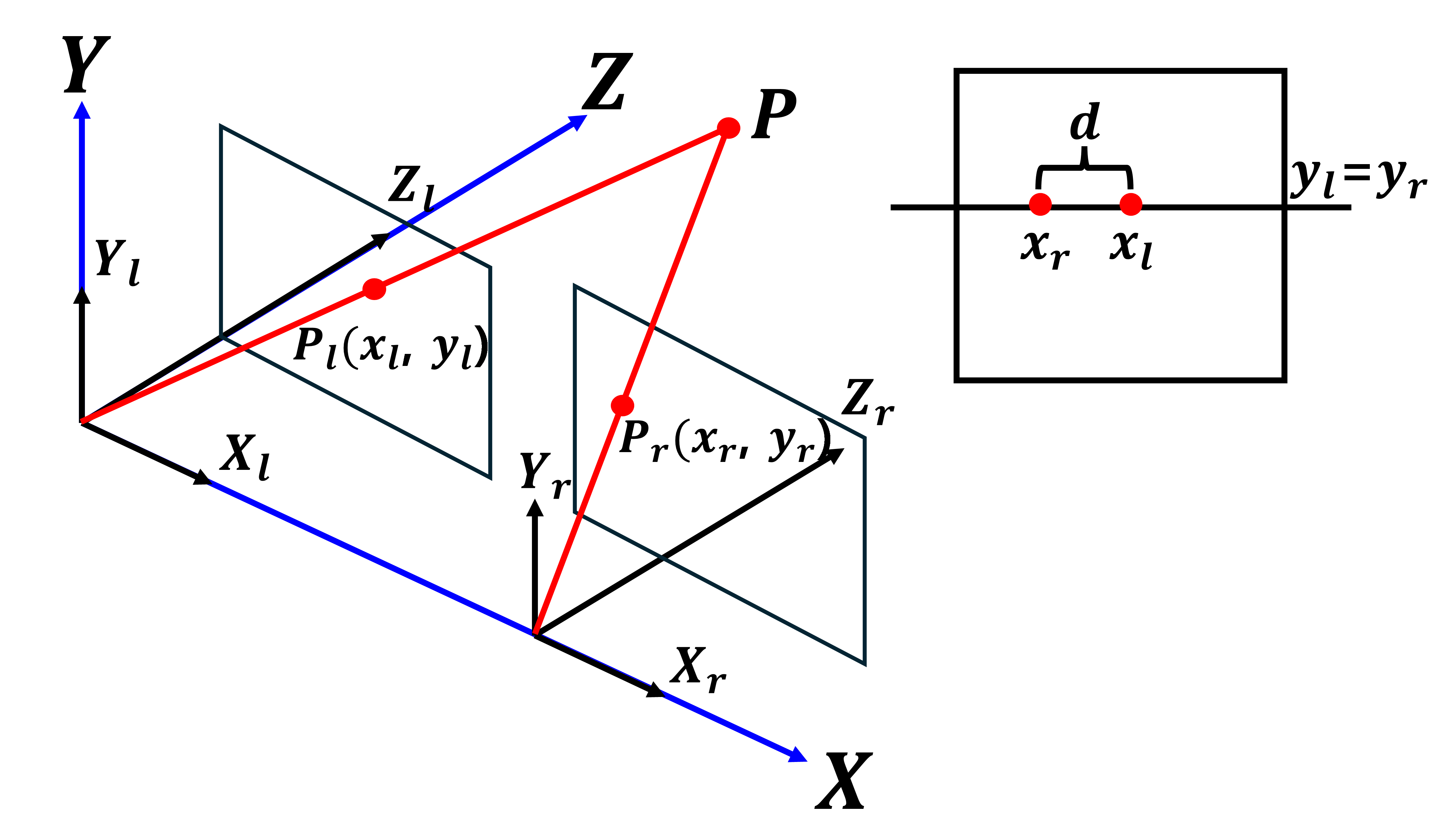 스테레오 비전이란 두 개의 카메라를 이용하여 카메라와 해당 물체 사이의 거리를 알아내는 컴퓨터 비전 기술이다. Fig. 6에 나타낸 바와 같이 전제 좌표계에서 어떠한 물체 $P$가 $P(x,\: y,\: z)$에 존재할 때, 두 카메라 위치를 원점으로 하는 로컬 좌표계