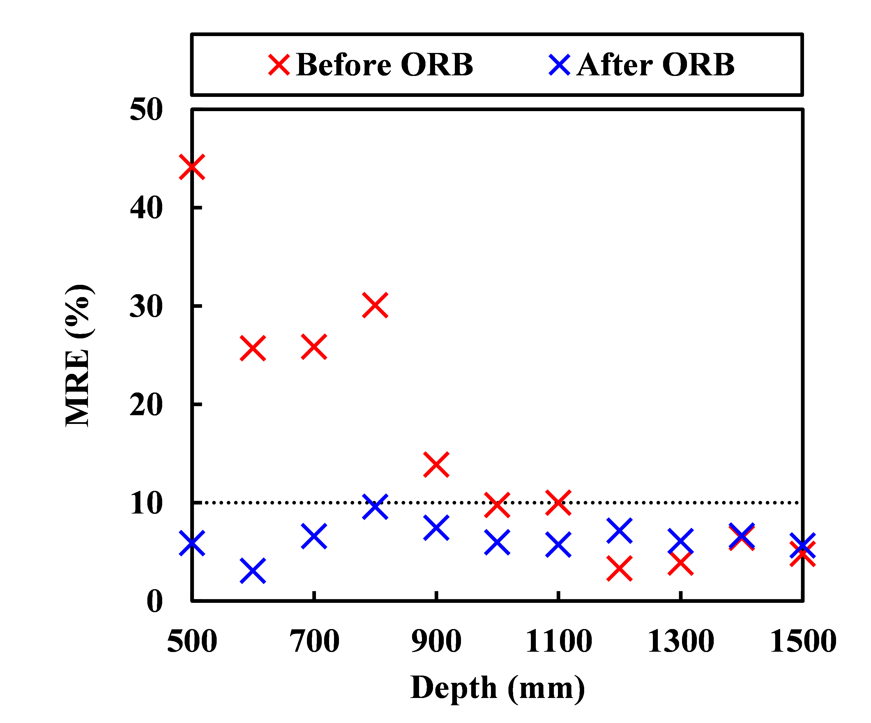 확장하여 진행하였다. Fig. 7에 나타낸 바와 같이, 최대 평균 상대 오차율(Mean relative error, MRE)은 500 mm 거리에서 48.74%, 최소 오차율은 1,200
