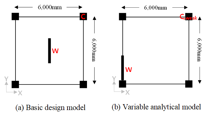 사용될 모델(Fig. 1(b) 참조)을 구성한다. 변수해석 모델은 기본 설계 모델에서 코어 벽체의 위치를 평면의 모서리로 이동시켜 의도적으로 비틀림 비정형을 발생시킨 구조물이다.
