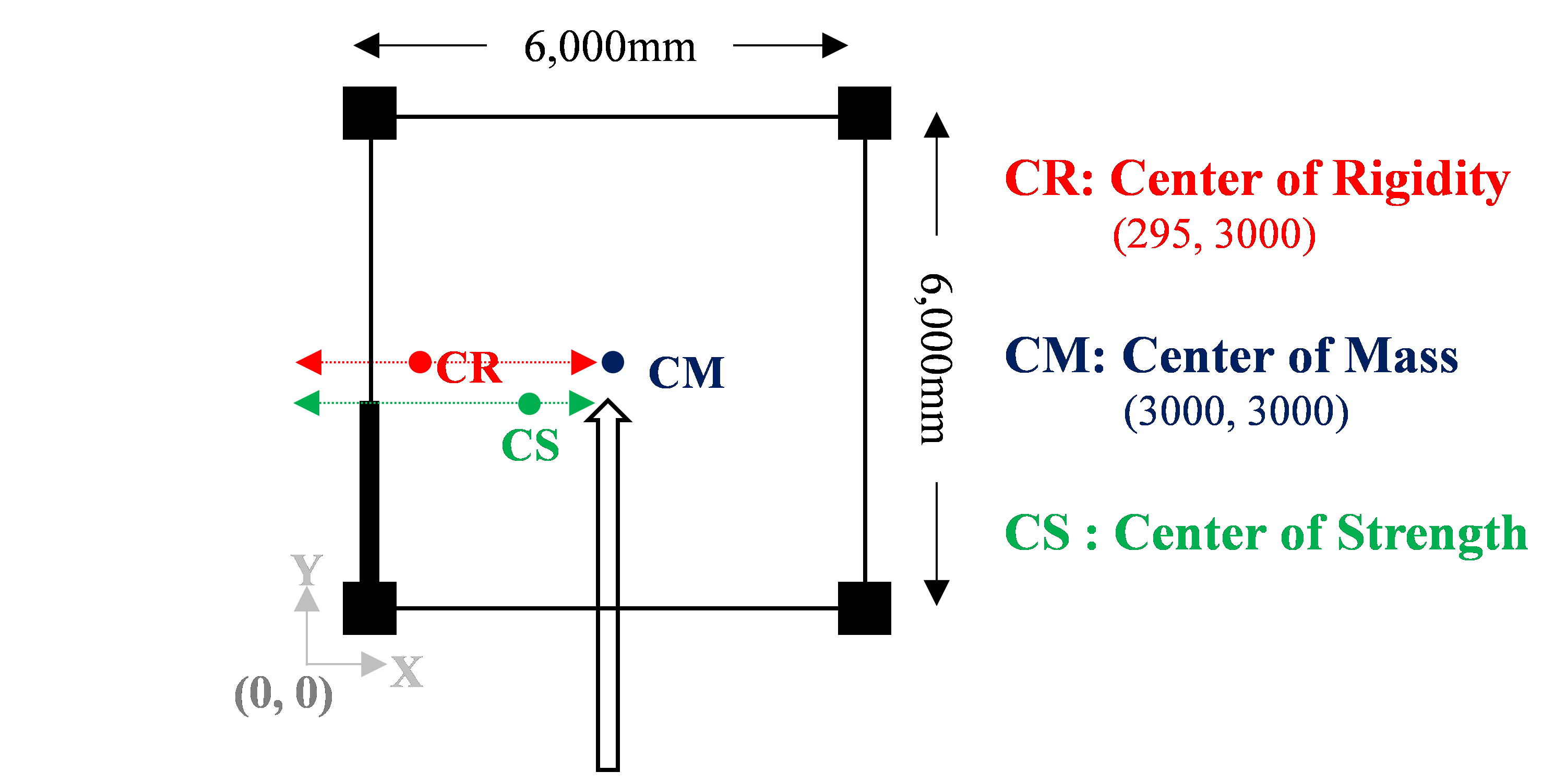 편심률 산정에 사용되는 편심은 질량중심(Center of Mass, CM)과 강성중심(Center of Rigidity, CR) 사이의 상대적인 위치