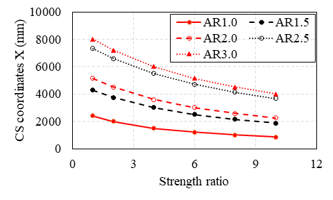이론적으로 기대했던 강도중심 위치와는 상당한 차이를 보였다. 강도비 10배(S10), 평면 형상비 3.0(AR3.0) 모델의 강도중심 해석값은 이론값의