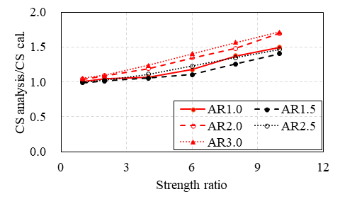 강도를 100% 발휘하는 이상적인 상태를 가정한 결과이다. Fig. 12에서는 형상비가 작고 강도비가 낮은 모델들은 설계단계에서 의도한 대로 부재들이 강도를 효과적으로 발현하지만, 형상비가 크고 강도비가 높은 모델들은