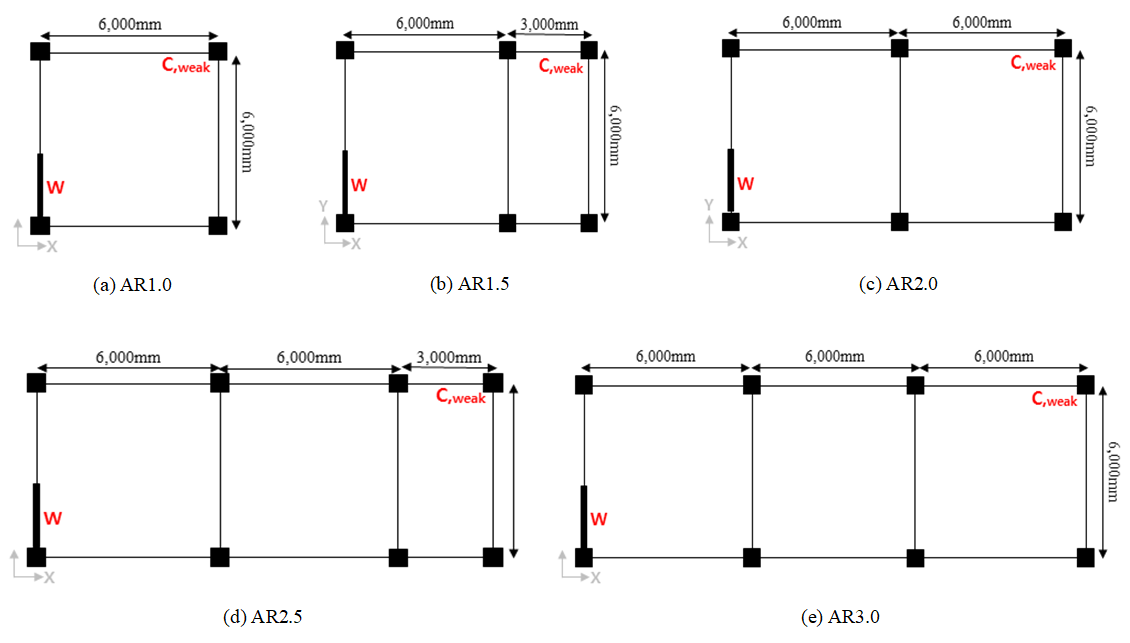 것을 목표로 한다. 이를 위해 두 가지 변수 약측기둥 강도에 대한 강측벽체 강도비(S)와 평면 형상비(AR)를 변수로 하는 해석을 계획한다. 본 연구의