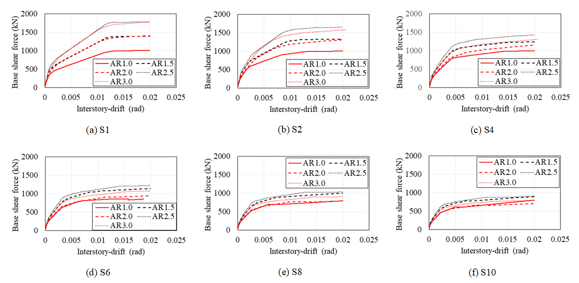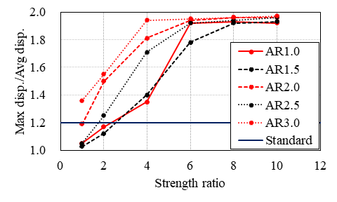 AR2.5 모델은 보다 작은 최대변위비를 나타내었고 강도비가 커지면 유사한 수준의 최대변위비를 나타내었다. 이러한 결과로 형상비가 증가하면 구조물