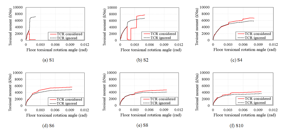 작용 시 부재들이 순차적으로 균열상태와 항복에 도달하면서 저항중심(강성중심, 강도중심)이 이동하고, 이에 따라 비틀림 모멘트도 변하게 된다. 또한,