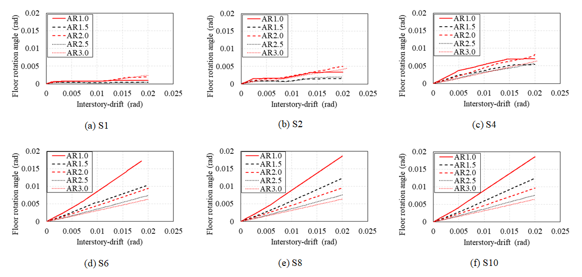 구조물의 평면회전각을 강도비와 형상비에 따라 Fig. 6에 나타낸다. 강도비가 증가할수록 동일 층간변형각에서 발생하는 평면회전각이 크게 증폭되었다. 강도비 1배(S1)모델의 회전각은 최대 0.002 rad