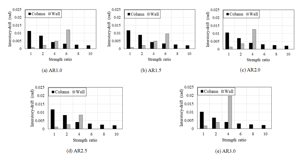 그래프에서 Column, Wall 두 막대그래프 중 더 낮은 층간 변형각에서 항복하는 부재가 그 모델의 붕괴를 지배하는 선항복 부재가 된다. 그래프