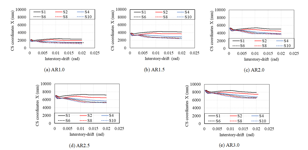 Fig. 9는 층간 변위가 증가함에 따른 강도중심(Center of Strength, CS)의 이동경로를 나타낸다.