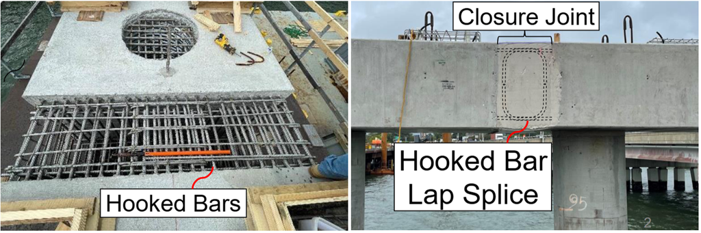 미국 콘크리트 설계기준(ACI 318-25) 및 여러 연구(Jahromi and Azizinamini, 2019; French et al., 2011; Breña et al., 2018)에 따르면, 갈고리 철근은 건축물의 보-기둥 접합부, Deck closure joint나 교각 캡 접합부 등에서