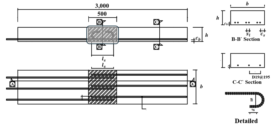 간격, 철근 직경, 횡보강근의 유무를 변수로 4점 휨 실험을 수행하였다. 다만, 사용된 갈고리 철근은 ACI 318-25에서 제안하는 철근 상세에 부합하지 않는 비표준 90° 갈고리였다. 실험 결과, 절반 이상의 실험체는 부착파괴, 나머지는 휨파괴를 보였다. 횡보강근이