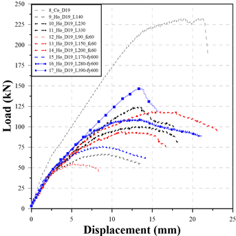 모든 실험체의 실험 종료 후 균열 진전 상태를 Fig. 5와 6에 나타내었다. Co-D19 실험체에서는 철근이 항복에 도달하였으며, 분리타설 구간 내의 휨 균열과 함께 PC-CIP 계면에 균열이 집중되었다. 실험