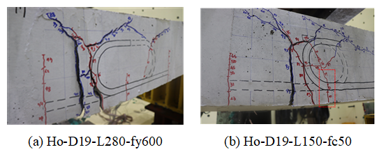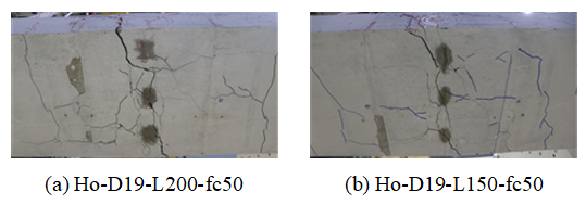 대각 방향의 균열이 나타났다. 이 대각 균열은 겹침이음이 시작된 곳과 맞은편 철근의 끝부분으로 연결되었다. 최대 하중에서는 이 균열의 균열폭이 확장되면서