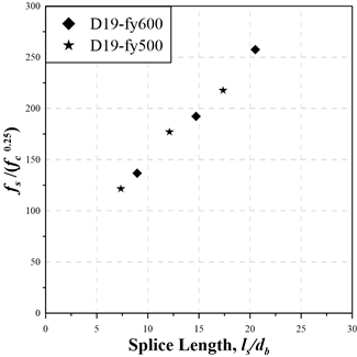 Fig. 7에 나타낸 실험결과에 따르면, 이음길이가 증가할수록 갈고리철근 이음의 정규화 강도는 뚜렷하게 증가하였다. 정규화된 철근 응력의 크기는 이음길이에 대하여