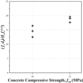 미치는 영향을 평가할 때 콘크리트강도의 효과를 제거하기위해 철근의 이음강도가 콘크리트 압축강도의 대략에 $f_{cm}^{0.25}$ 비례한다는 결과를