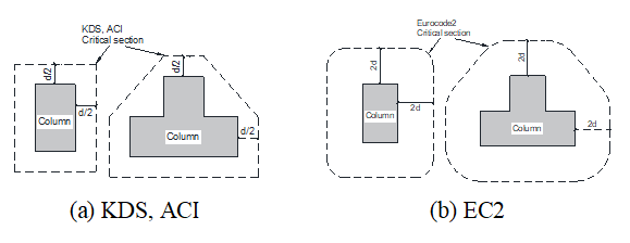 뚫림 전단강도에 중요 영향인자 중 하나인 위험 단면의 위치를 국가별로 다르게 정의하고 있다. Fig. 1과 같이 KDS와 ACI 현행기준에서는 기둥 면에서 슬래브 유효두께의 절반 위치인 사각 단면으로 위험 단면을 정의하고, EC2 현행기준에서는 기둥