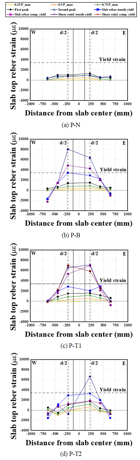 반면, 보강 실험체인 P-B, P-T1 및 P-T2에서는 기둥 외곽 d/2 위치에서 명확한 항복이 확인되었으며, 외측 이동할수록 변형률이 급감하여