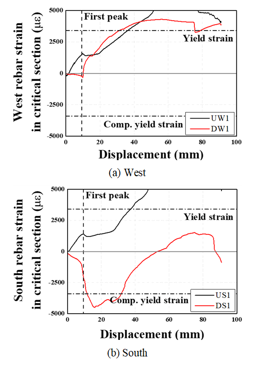 최대 내력 이후 인장 측으로 응력 방향이 전환하였다. 최종적으로는 해당 위치에서 항복 변형률에 도달하는 거동을 보였다.