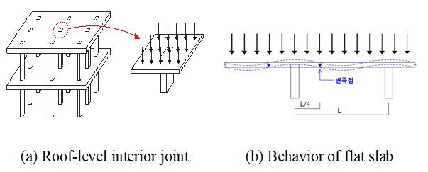 Fig. 2(a)와 같이 지하 주차장의 지붕 층 슬래브-기둥 내부 접합부이며, 실제 건축물의 1/2 scale로 계획되었다. 또한 Fig. 2(b)와 같이 중력하중을 받는 무량판 구조의 거동을 재현하고, 거동 시의 발생하는 변곡점 사이를 실험 구간으로 선정하였다. 변곡점의 위치는 슬래브 경간의